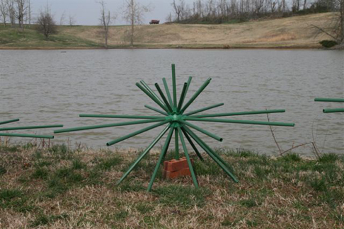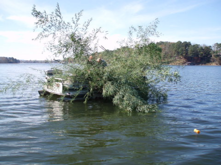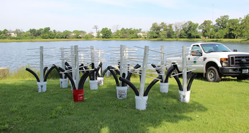 A second method to significantly improve fish habitat is to provide suitable manmade structures. There are any number of types of small and large structures that can be easily constructed and placed in the lake. Smaller structures can be placed in the shallower areas, and larger one in deeper water. They can be made with native terrestrial vegetation such as brush, small trees, limbs, bamboo, etc. weighted to hold on the bottom. They can also be made of concrete blocks, PVC pipe, wood, old pallets, etc. Just a few of these structures will result in an increase of fish numbers and diversity in that area. Manmade structure will provide many of the same benefits as littoral zone vegetation and last many years. Below are photos of a few structures various individuals and fishing clubs have devised and installed.